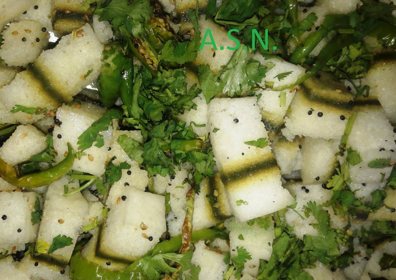- For Seasoning, heat oil in small wok/kadai. Crackle the mustard seeds and sesame seeds into it. Add sliced green chilli and hing. Spread the same over the sandwich dhokla. and garnish with chopped Coriander leaves.
