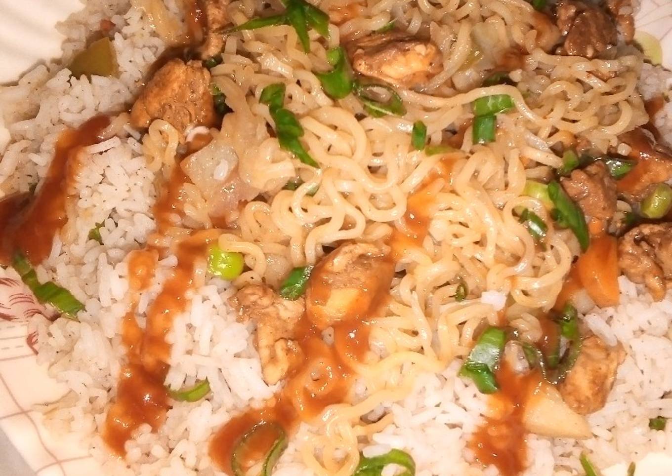 - Now, assemble all the things. First add the layer of rice into the plate, then the noodles and chicken at the top. Garnish it with the green part of onion and drizzle some ketchup over the top to give it tempting look.