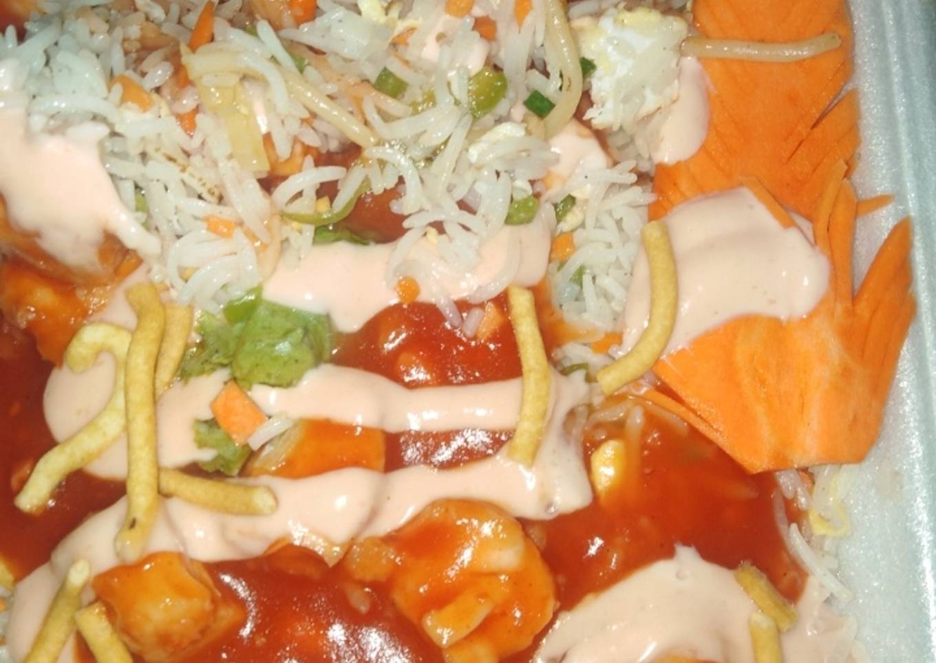 rice 2cups (fully boiled with 1 tbs salt) noodles 1 cup (fully boiled with 1 tbs salt) oil 3 tbs eggs 3 (whisk and add 1/4 ts salt & black pepper make scrambled eggs and keep aside) ginger & garlic paste 1 tbs dark soya sauce 3tbs salt 1 ts crushed black pepper 1 1/2 ts red bell pepper 1 small (julienne cut) cabbage 1 cup (finely cut) carrot 1/2 cup (grated) fresh ginger 1 inch (julienne cut) bullet green chillies 4 (sliced) spring onions 1/2 cup - : : heat a ts of oil and add the whisked eggs with salt, black pepper and cook it well and keep aside.heat oil in a pan and fry the ginger & garlic paste for 2 minutes on high flame, then add the chicken and cook it completely on high flame.when the chicken is cooked add the tomato ketchup, dark soya sauce, sugar, salt, crushed black pepper, red chillie powder, crushed red chillie, 1 cup of water mix well, cover and cook for 4 minutes on medium flame, and the gravy is ready.