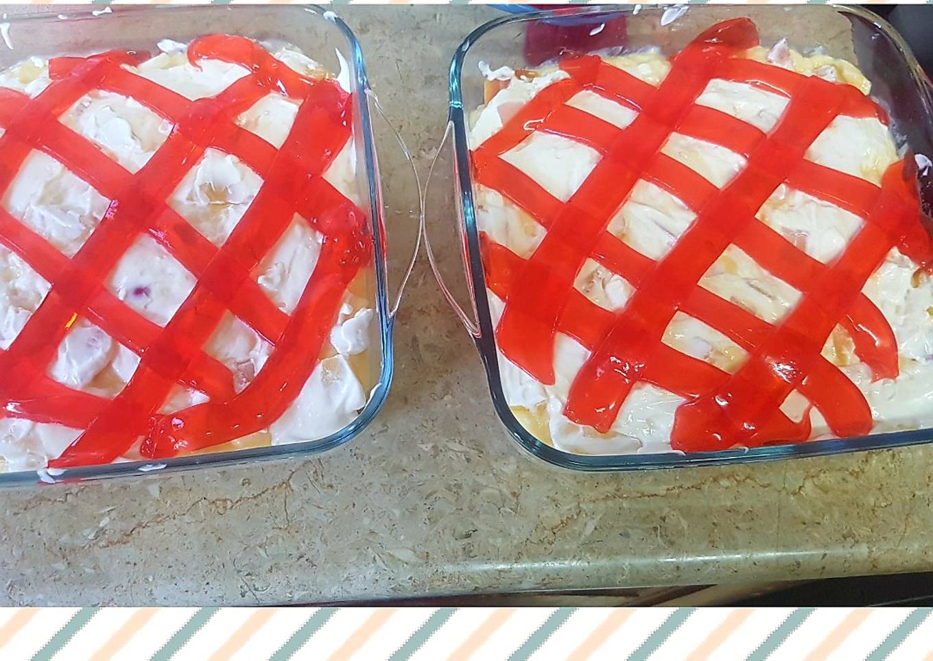 - In servind dish spread thin slices of plain cake xnd moist it with cocktail syrup. Spread custard,layer with fruits and jelly then cream finally decorate it with more jelly